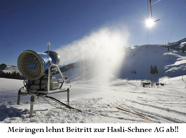 Das FORUM Meiringen empfiehlt den Gemeindebürgern von Meiringen aus gemeindepolitischen, finanziellen und ökologischen Gründen dem Beitritt der Gemeinde Meiringen zur Hasli Schnee AG nicht zuzustimmen.