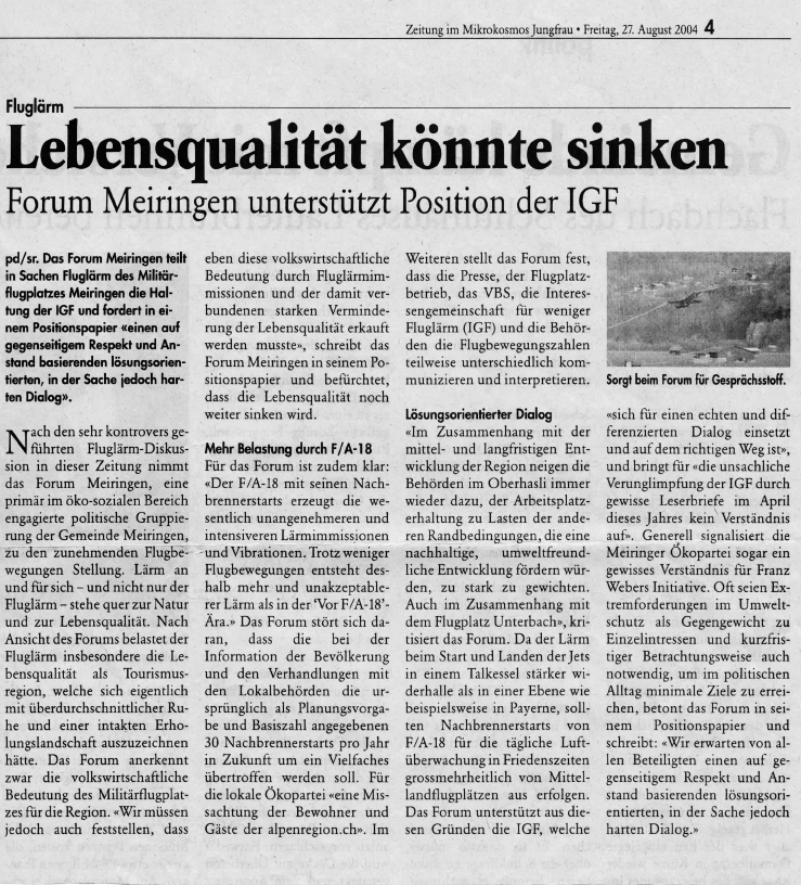 Auseinandersetzung um Fluglärm Militärflugplatz Meiringen - Unterbach